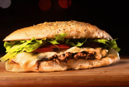 120g de lascas de file mignon grelhado, envolto de queijo derretido e molho de gorgonzola, tomate e alface, pão baguete. (Acompanha molho a sua escolha).